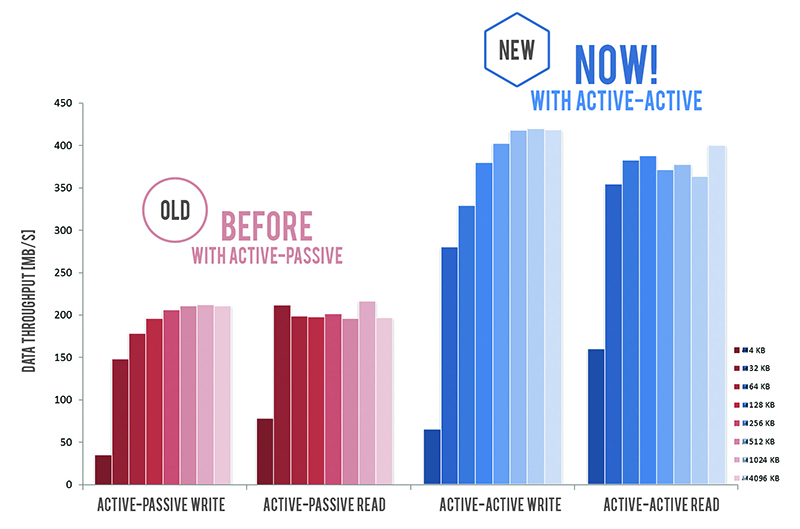 Dank der Active-Active-Funktionalität werden alle Schreib-, Lese- und Replikationsprozesse auf beide Nodes verteilt die Performance dadurch verdoppelt. Innerhalb weniger Minuten stehen Ihnen mehrere hundert Gigabyte in Ihrem Netzwerk mit nur wenig Aufwand und ohne Ausfallszeit zur Verfügung.