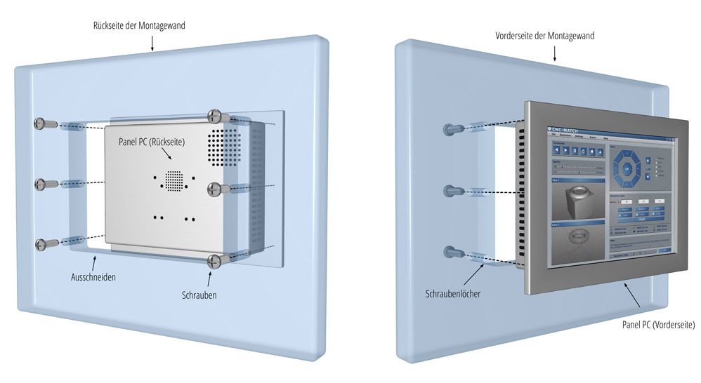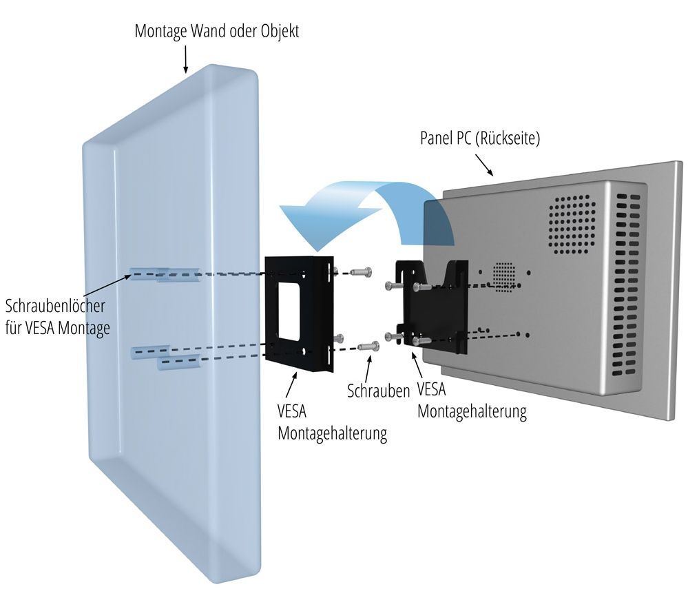 Hochwertige Panel PCs bedürfen einer ebenso hochwertigen Befestigung. Deshalb haben wir für jedes Einsatzgebiet die passende Befestigungsart parat - ob eine fixe Montage an der Wand, verschiedenste VESA-Halterungen mit und ohne Gelenk, oder eine individuell angefertigte Befestigung. Ein Beispiel: Für den Einsatz in der Gebäudeautomation eignet sich besonders die Wall-Mount-Montage. Hierbei wird das System ohne Gehäuse in ein passendes Loch an einer beliebigen Stelle wie beispielsweise einer Wand gesetzt und von vorne verschraubt. Danach wird ebenfalls von vorne eine aufsetzbare Frontblende, z.B. mit Clips oder Magneten, befestigt. Das verhindert einerseits unschöne Schraubenköpfe, hat andererseits aber den praktischen Nutzen, das der Panel-PC bei Wartungsarbeiten sofort erreichbar ist. Egal ob Sie sich für eine der normierten VESA-Befestigungen entscheiden oder eine individuelle Halterungs-Lösung suchen. Dank unserer jahrzehntelangen Erfahrung sind wir der ideale Partner, wenn es um die richtige Befestigung Ihres Panel-PCs geht. Sollte die gewünschte Halterung dabei nicht in unserem Angebot enthalten sein, helfen wir Ihnen mit unserer reichen Erfahrung aus zahlreichen, erfolgreich umgesetzten Projekten gerne weiter. Unser Beraterteam steht Ihnen jederzeit für eine Anfrage zur Verfügung. Für einen ersten Überblick finden Sie nachstehend eine kurze Erläuterung der gängigsten Befestigungs-Methoden.