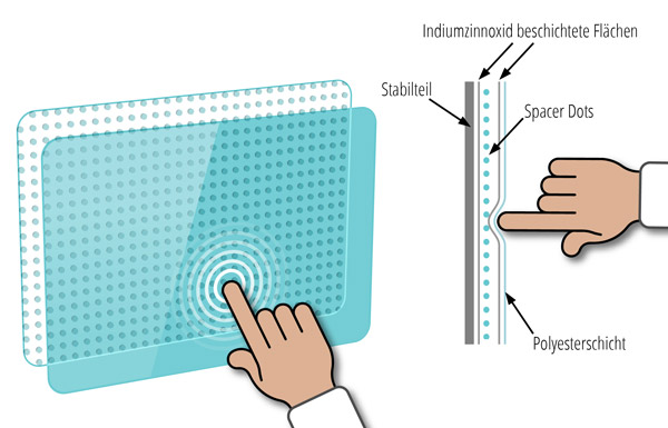 Die resistive Touchscreen-Technologie arbeitet hierbei mit zwei leitfähigen Schichten, wobei eine Lage aus einer Polyesterscheibe und die andere meist aus Glas oder Kunststoff besteht. Diese beiden Scheiben haben durch den Einsatz von Abstandshaltern (Spacer Dots) immer einen bestimmten Abstand zueinander und sind mit einem leitfähigen Material beschichtet. In den resistiven Touchscreens unserer Panel-PCs kommt etwa Indiumzinnoxid zum Einsatz. Wird der Touchscreen dann berührt, ändert sich punktuell der Abstand zwischen den Scheiben und damit auch der Widerstand. Durch das ständige Messen der unterschiedlichen elektrischen Spannungen kann am Ende die exakte Position des Druckpunktes bestimmt werden.