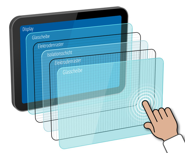 Projiziert-kapazitive-Touchscreens haben grundsätzlich dieselben Vorzüge wie Oberflächen-kapazitive-Displays und sind so für die gleichen Anwendungsgebiete geeignet. Allerdings können Sie aufgrund eines anderen Aufbaus deutlich dünner gefertigt werden. Der Grund dafür ist: bei ihnen sind die Sensoren auf der Rückseite montiert, während bei den Oberflächen-kapazitiven-Displays die Elektroden in der Bildschirmumfassung sitzen.